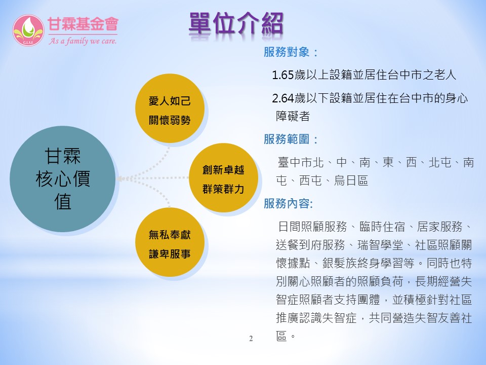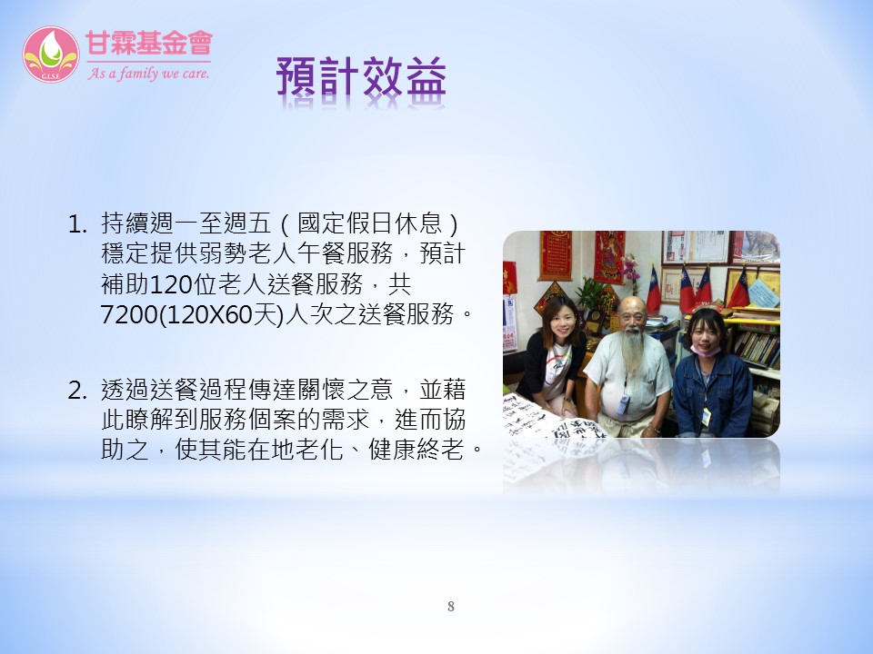 入選單位四:財團法人台中市私立甘霖社會福利慈善事業基金會「聽見角落的聲音-弱勢獨居長輩送餐服務」